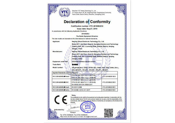 南京帝淮电子科技有限公司,国内工业遥控器行业领军企业,自主研发、定制、非标设计各类工业级无线遥控器、工业级有线控制器、智能化自主算法逻辑的本地控制器等系列产品。已经申请及正在申请的技术专利、外观专利有近三十项左右,并通过了CE欧盟认证、国家级试验检验报告、EMC电磁兼容认证等。